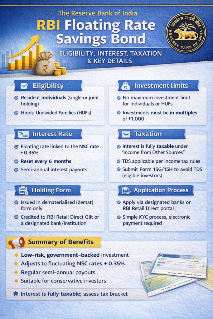Below is a detailed overview of the RBI Floating Rate Savings Bond, covering eligibility, investment limits, interest structure, taxation, and other key aspects.
